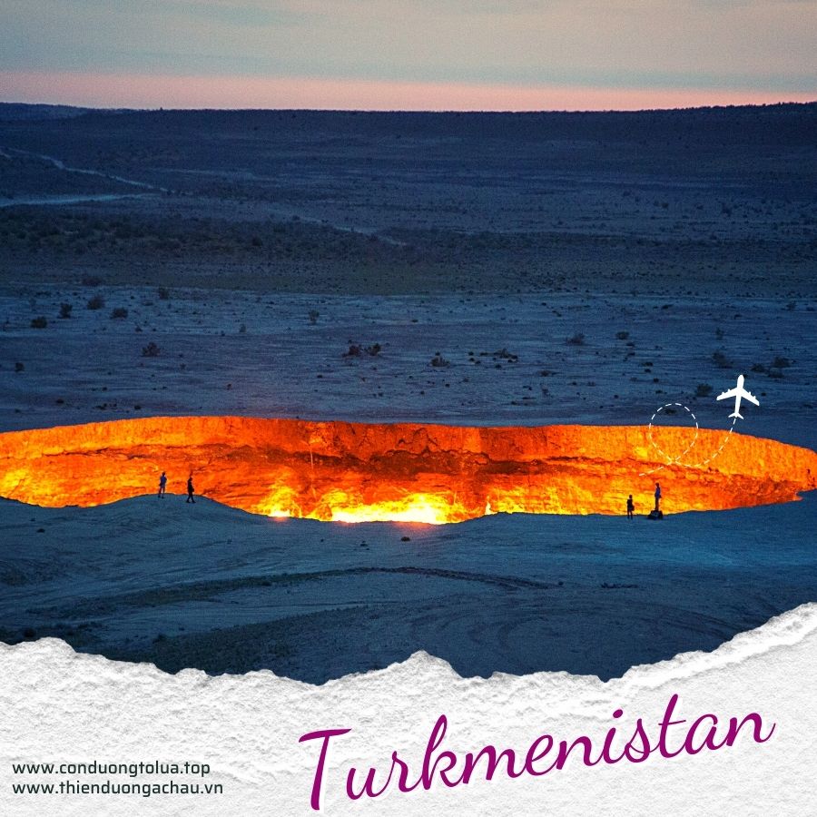 TURKMEITURKMENISTAN : một trong những quốc gia biệt lập luôn khiến du khách tò mò . Hơn thế đất nước này có ba di sản văn hóa thế giới đều tọa lạc trên con đường tơ lụa xa xưa đó là quần thể di tích Kunya - Urgench , pháo đài Nisa của người Parthia và khu khảo cổ Merv gần thành phố Mary có niên đại hàng nghìn năm . Turkmenistan phát triển du lịch từ " cánh cửa địa ngục " đó là vách miệng núi lửa Darvaza nhân tạo nằm giữa lòng sa mạc Karakum .